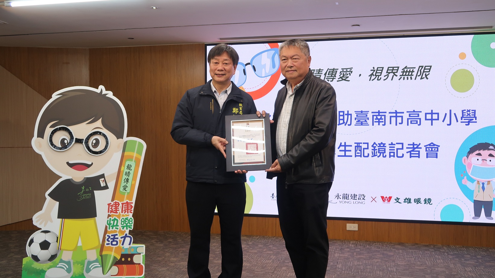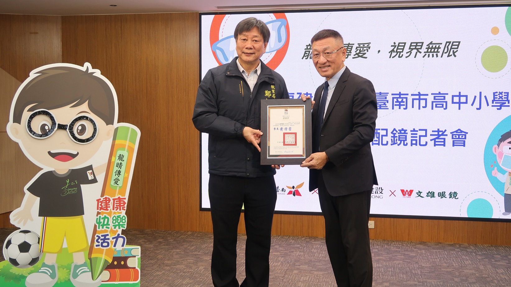 視力保健是每個孩子成長的重要基石,也是臺南市長黃偉哲重視的學童健康議題。在地優質企業永龍建設公司為回饋社會,連續六年捐助南市弱勢學生免費配鏡計畫,113學年市府與永龍建設及文雄眼鏡再次攜手延續此護眼行動,今(31)日在市府永華市政中心舉行捐贈感謝儀式。教育局鄭新輝局長代表市長出席,並頒發感謝狀,向支持單位表達市府的深切感謝。
