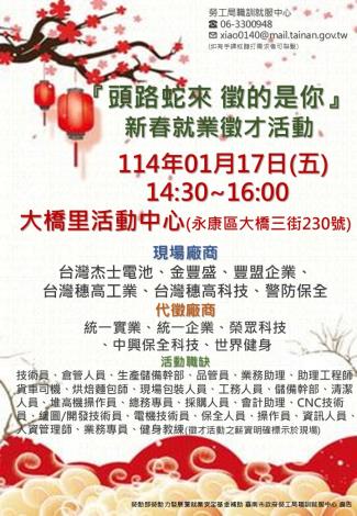 為打造黃偉哲市長「希望家園」的施政願景,勞工局積極辦理各項就業徵才活動,並因應產業求才需求,勞工局職訓就服中心將於01月17日(週五)14時30分至16時在大橋里活動中心(臺南市永康區大橋三街230號)辦理『頭路蛇來 徵的是你』新春就業徵才活動,邀請11家廠商提供140個職缺,歡迎求職民眾踴躍前往參加,洽詢電話:06-3300948。