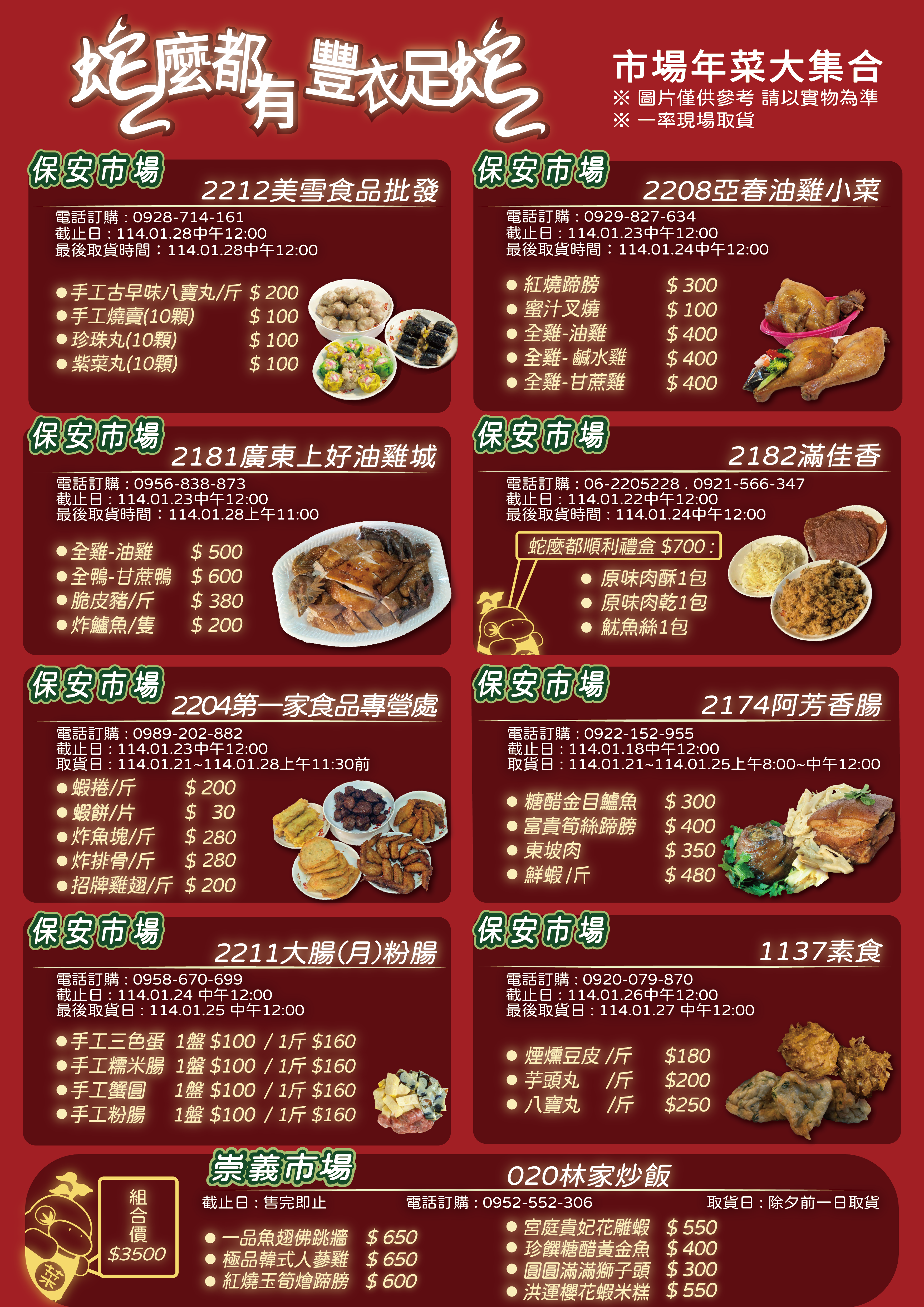 經發局長林榮川表示,玉井市場、文華市場與崇義黃昏市場皆推出除夕團圓年菜,最低只要3300元就可以把整桌的豐富年菜帶回家圍爐,讓民眾在家能輕鬆享受到專業大廚準備的精緻餐點,除了年菜,市場亦是過年伴手禮採買的好選擇,保安市場推出的「蛇麼都順利禮盒」,讓民眾帶著來自市場最溫暖的心意拜訪親朋好友。