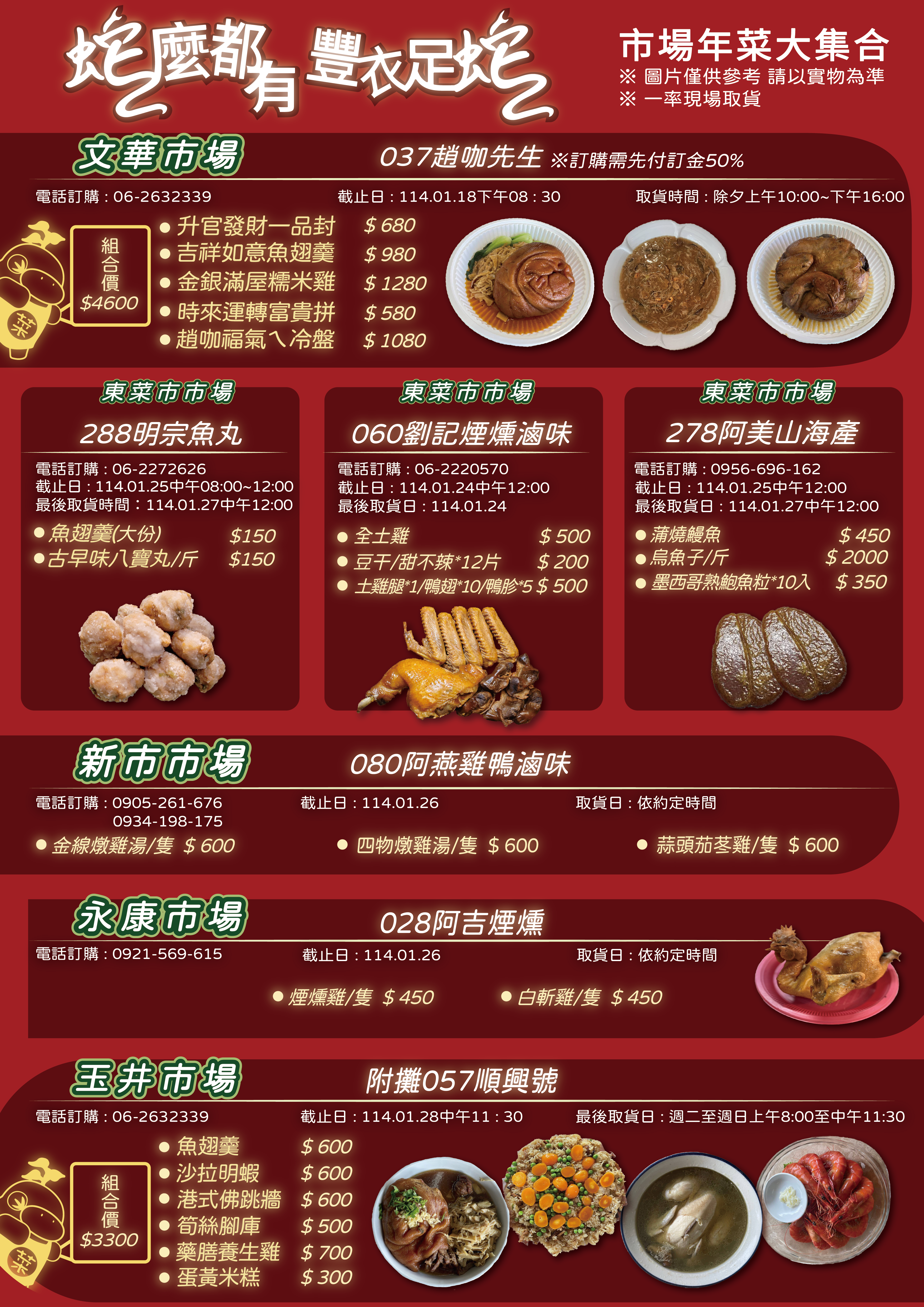 臺南的市場裡隱藏了許多美食,不只是家家戶戶日常三餐的桌上常客,更是除夕團圓夜裡不可或缺的珍饈美饌,為了讓民眾豐衣足「蛇」迎接金蛇年,臺南市市場處特別盤點東菜市、保安市場、文華市場、新市市場、永康市場、崇義黃昏市場、玉井市場等7處市場總共16攤推出年菜菜品或組合,「蛇」麼都有,讓民眾在家圍爐也可以享用到頂級廚師烹調的極致美味。