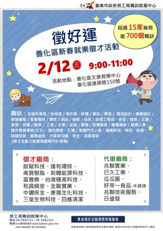 114/02/12(三)勞工局職訓就服中心辦理【徵好運】善化區新春就業徵才活動,歡迎求職民眾踴躍參加