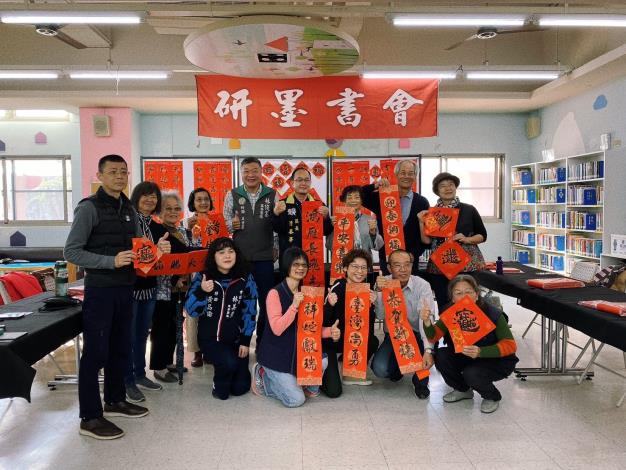 上午10時首先登場是借書贈春聯活動,由臺南市研墨書會蔡天健會長率同10位書法老師,在安平區圖書館一樓,現場揮毫書寫春聯並供民眾索取,每位老師展現多樣書寫風格,揮毫1字、4字和7字對聯,以及慶賀棒球12強奪冠風潮,寫出「台灣尚勇」春聯,引起民眾索取的熱度,活動現場掛滿書法家手寫待乾的大紅春聯,場面喜氣洋洋且和樂融融,春聯上面的吉祥祝福語結合小龍圖案,讓民眾愛不釋手,吸引許多的讀者踴躍到櫃台借閱圖書。