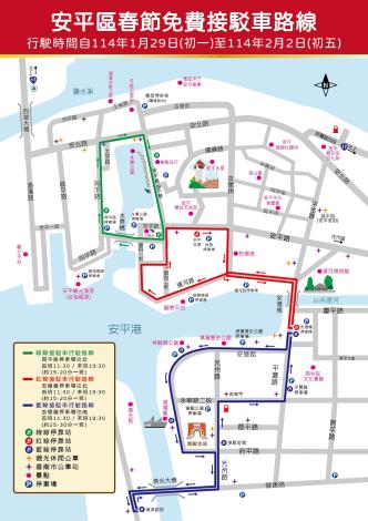 迎接農曆新年到來,為服務春節期間遊客,安平區公所於安平開臺天后宮對面停車場前設置「遊客服務臺」(1月29日(初一)至2月2日(初五),10:00至18:00),除備有觀光導覽地圖等精美摺頁免費索取,並提供小吃景點介紹、出入交通動線引導等服務。
