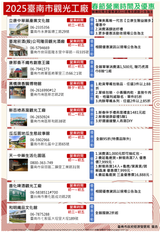 金蛇迎春添喜氣,臺南市觀光工廠熱情迎接遊客,春節期間特別營業,提供多樣展示內容及豐富DIY體驗活動,呈現濃厚的節慶氛圍,是闔家出遊的好選擇。為便利民眾春節出遊,經發局盤點各家觀光工廠春節營業時間及優惠活動,邀請大家來臺南歡樂迎新春。
