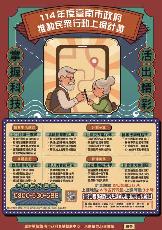 歡迎市民邀請親朋好友共同報名,透過社區發展協會、里長、市民團體、長照中心或長青學苑等單位,撥打免費服務專線 0800-530-688 安排行動教室。此外,也可至官方網站(https://elearning.tainan.gov.tw)了解更多課程詳情,搶先掌握報名名額!