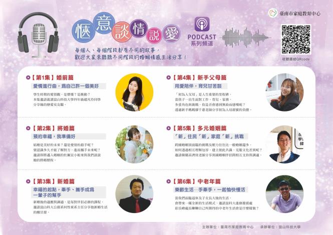有感現今家庭衝突的主因,常來自於家長之間教養觀念不同所致,臺南市家庭教育中心為營造良好的親子互動關係,穩定孩子的情緒發展,針對伴侶相處及家庭教養等議題,以真人真事經驗訪談方式,於去(112)年底上線的「家庭教育園地PODCAST頻道」共製播11集,推出2個月即獲得上千位民眾點聽回應,獲得高度共鳴及迴響。