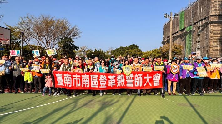 南區區公所今(9)日在開南公園辦理登革熱誓師大會,由市政府民政局陳仁偉科長、登革熱防治中心李玉琳組長與曾大原組長、地方民意代表、區長蕭琇華偕同轄內37里里長、環保志工及社區居民等逾400人共同參與誓師活動,宣示南區齊力防疫對抗登革熱的決心,除雇請「小蜜蜂」進入小巷弄宣導登革熱防治,更協請各里里長透過里內廣播器及大聲公擴音器等多元方式來宣導,文南里里長陳清泉及南都里里長高麗雲更以行動宣導車,來籲請民眾平時應主動巡檢居家環境,落實『巡、倒、清、刷』,仔細巡視戶內外容器,將積水倒掉並澈底清除。