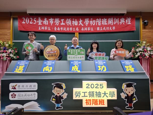 為落實黃偉哲市長「希望家園」的施政願景,臺南市政府攜手國立成功大學開辦「勞工領袖大學初階班」於今(13)日開訓,臺南市政府勞工局局長王鑫基、主任秘書陳美顏、成功大學推廣教育中心主任辛致煒及國際經營管理研究所所長張佑宇等人出席,期勉學員透過終身學習,強化職場能力,邁向成功之路,領航未來發展。