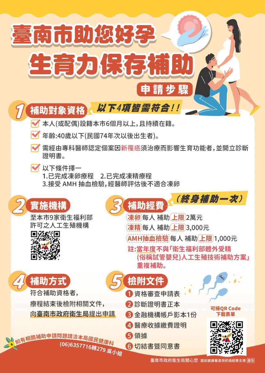 不僅如此,臺南市政府更於114年起提供「助您好孕-生育力保存補助」,減輕新罹癌民眾在癌症治療前凍卵或凍精的經濟負擔,給自己一個未來成為父母的機會!只要是設籍臺南市滿6個月以上,且40歲以下的新罹癌市民,經專科醫師評估有需求者,完成凍卵或凍精療程後,可向衛生局申請最高2萬元補助。詳情請查詢臺南市政府衛生局官網( http://p.tainan.gov.tw//n62oQ2 )。