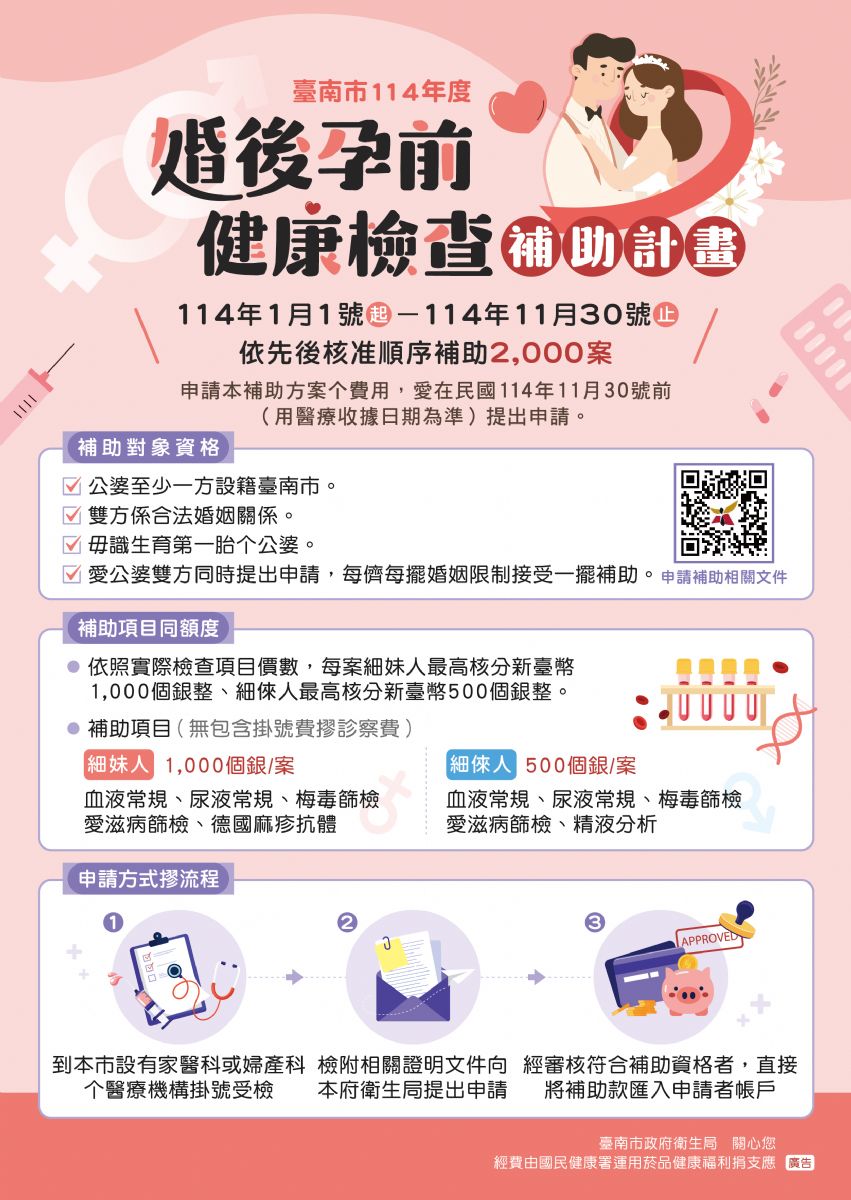 為了幫助您和另一半掌握身體狀況,安心迎接好孕,臺南市政府於114年推出「婚後孕前健康檢查補助」,只要其中一方設籍臺南市,並在沒有生育第一胎的情況下,夫妻雙方同時在臺南市合作醫療院所完成補助項目檢查,就能申請婚後孕前健康檢查補助,最高可獲得1,500元補助!詳情請查詢臺南市政府衛生局官網( http://p.tainan.gov.tw//e7WLH )。