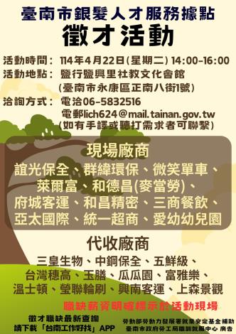 為打造黃偉哲市長「希望家園」的施政願景,勞工局積極辦理各項就業徵才活動,並因應產業求才需求,臺南市銀髮人才服務據點將於4月22日(二)下午2點至4點舉辦聯合徵才活動,地點於鹽行鹽興里社教文化會館(臺南市永康區正南八街1號),邀請22家廠商提供377個職缺,歡迎求職民眾踴躍前往參加,洽詢電話:06-5832516。