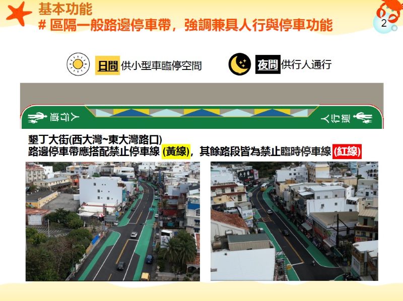 這樣的設計,是希望白天能讓車輛有地方臨停,不會擠占行人空間;到了夜間,車輛一律不得停放,整段路邊空間就還給行人,提升整體通行品質與安全,也讓墾丁大街在夜間成為更友善、更舒適的步行空間。