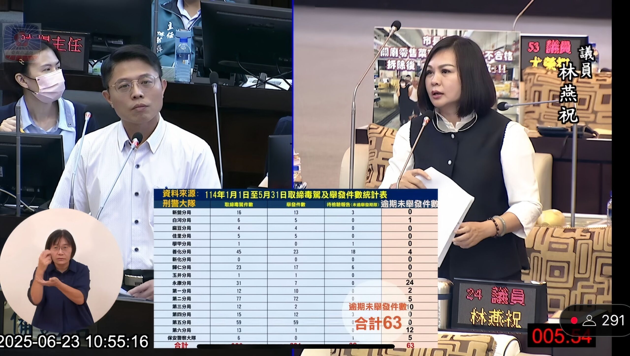 對於取締毒駕案件逾期未舉發,林燕祝指出,從今年1月至5月31日止,刑大統計取締毒駕案件數合計326件,其中逾期未舉發的案件卻有63件,她進一步了解後得知,這些逾期未舉發的案件很多都是因為送尿檢拖延,檢驗報告回覆分局後,同仁因其他業務繁重而沒有做持續追蹤,導致案件無法在《道路交通管理處罰條例》第90條規定的2個月內完成舉發,造成執法落空,請各分局做好橫向的聯繫,遏止毒駕。