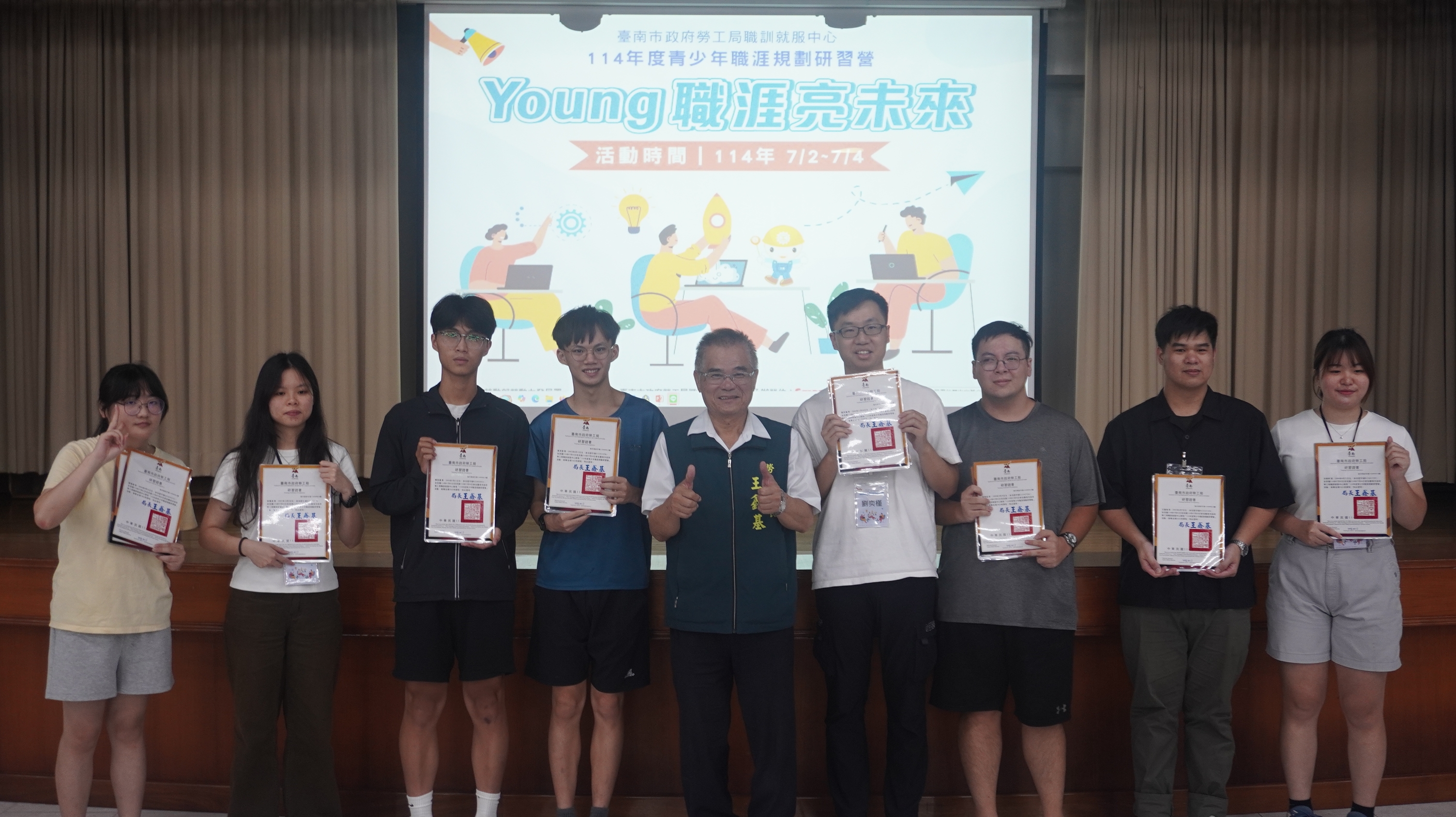 勞工局王鑫基局長結訓時也勉勵學員能夠把研習營所學經驗帶回學校及未來職場,同時要善用政府就業、職訓相關資源,才能順利找到適才適所的工作,穩定就業,更重要的是他也呼籲不管目前是在臺南或是外縣市求學,未來畢業都能選擇在臺南安居樂業。