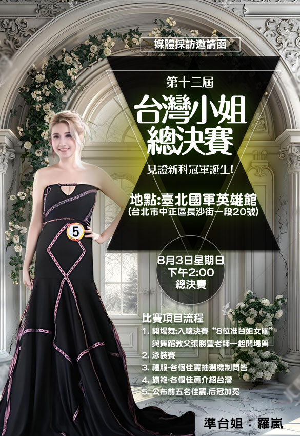 【記者林意雯/台北報導】 一年一度最具指標性的選美盛事——第十三屆台灣小姐總決賽,將於2025年8月3日(星期日)下午2點,在臺北國軍英雄館隆重登場。來自全台的菁英佳麗雲集,角逐后冠的榮耀。其中,身穿編號「5號」的準台姐羅嵐,以自信優雅的姿態及多元才藝備受矚目,成為媒體與觀眾焦點。