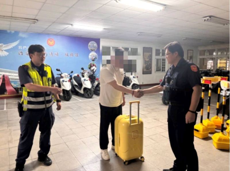 林姓民眾(69年次)表示自己與友人至林邊餐敘完,駕駛皮卡車返回枋寮時,驚覺放在後車斗上的行李箱不翼而飛,猜想可能是在途中掉落,回頭沿路尋找卻遍尋不著,至枋寮分局東海所及佳冬所詢問均未果,抱著最後一絲希望踏進林邊所請求協助。後巡邏員警黃光輝、林暐程巡經中興路36.5公里處時,眼尖發現田地旁道路橫躺著一只黃色行李箱,林男驚喜表示那就是他苦尋不著的行李箱,並激動地說裡面放有護照及重要物品,若不是員警尋回,友人恐怕就搭不上明天的班機,其感激之情溢於言表。