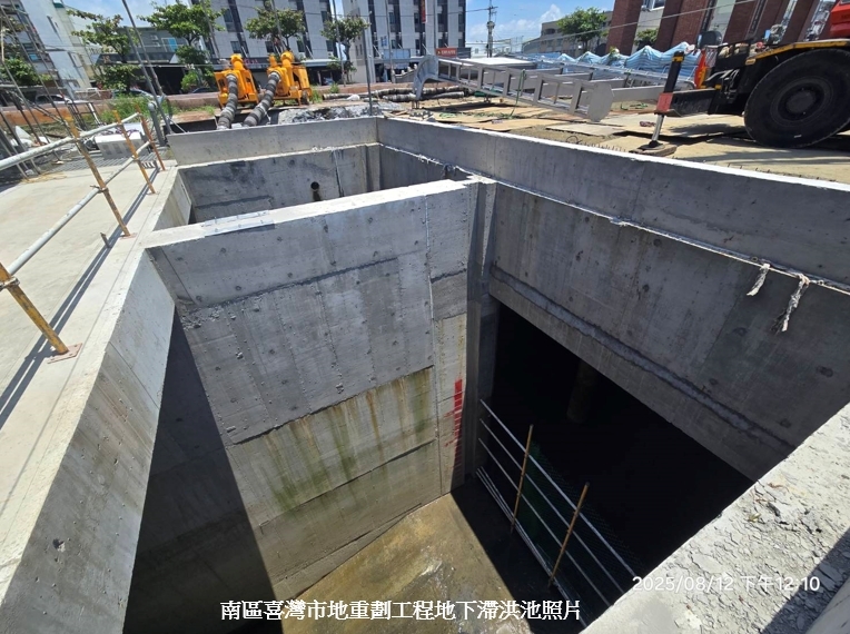 不僅如此,已完工的麻豆工業區兩座滯洪池容納10萬噸蓄水量,九份子重劃區公園兼滯洪池也發揮滯洪和景觀的作用。目前尚在施工中的多個重劃區滯洪池也提早發揮功能,安南區怡中市地重劃區滯洪量9,053噸,永康區的崑大路市地重劃區滯洪量6,205噸,六甲頂醫療重劃市地重劃區滯洪量3,483噸,南科FG區段徵收開發區滯洪量7.5萬噸,位於南區喜樹灣裡市地重劃區滯洪量11,800噸,各開發區責成施工廠商平時確實維護工區及週遭排水系統,於暴雨期間加強工地巡查確保水路通暢無虞,協助將周遭排水引流至開發區內,透過滯洪設施及出流管制作為,緩解區域排水負荷,落實開發與防災並重的理念。