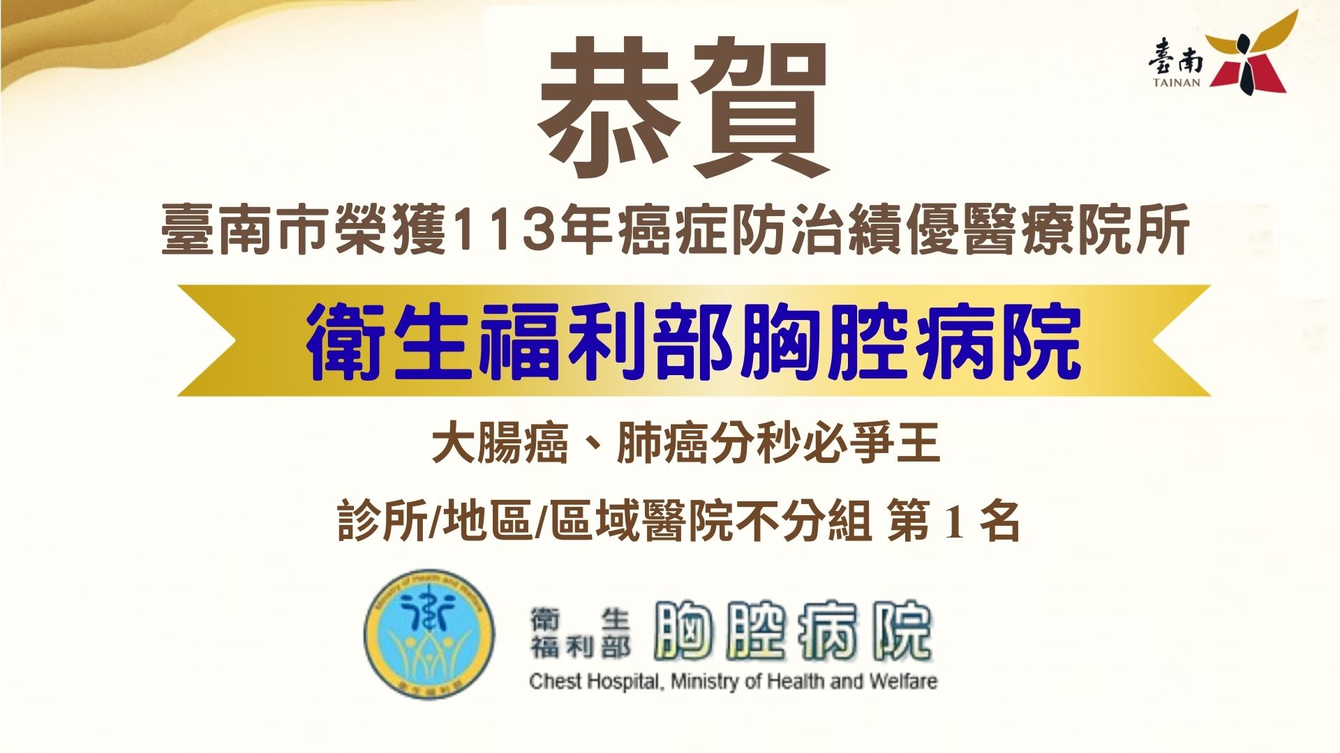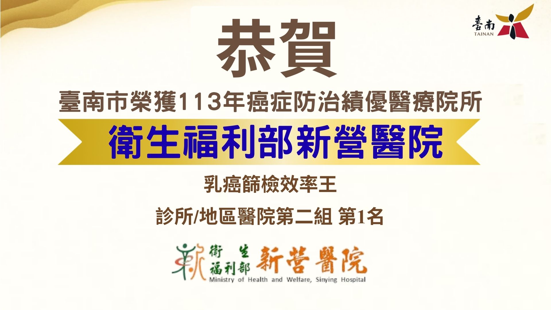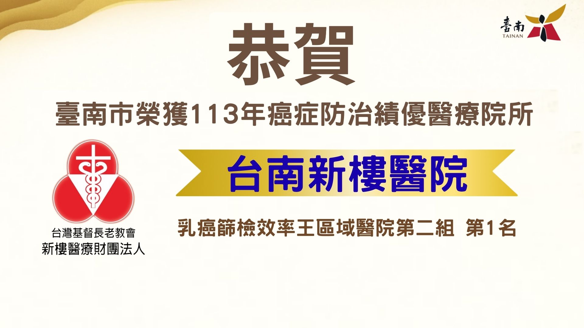 國民健康署昨日(8/13)於張榮發基金會國際會議中心舉行114年「癌症防治績優醫療院所表揚典禮」,臺南市醫療院所表現卓越,再次榮獲多項殊榮。衛生福利部臺南醫院憑藉卓越的大腸癌及乳癌篩檢成效,榮獲「大腸癌篩檢效率王」及「乳癌篩檢效率王」二項大獎;台南新樓醫院則在乳癌篩檢效率上的卓越表現,榮獲「乳癌篩檢效率王」;衛生福利部新營醫院在地區醫院組中,以優秀的乳癌篩檢效率榮獲「乳癌篩檢效率王」第一名;衛生福利部胸腔病院則在地區醫院組中,榮獲「大腸癌及肺癌分秒必爭王」,以表現出色的癌症陽性個案追蹤成績獲得肯定。