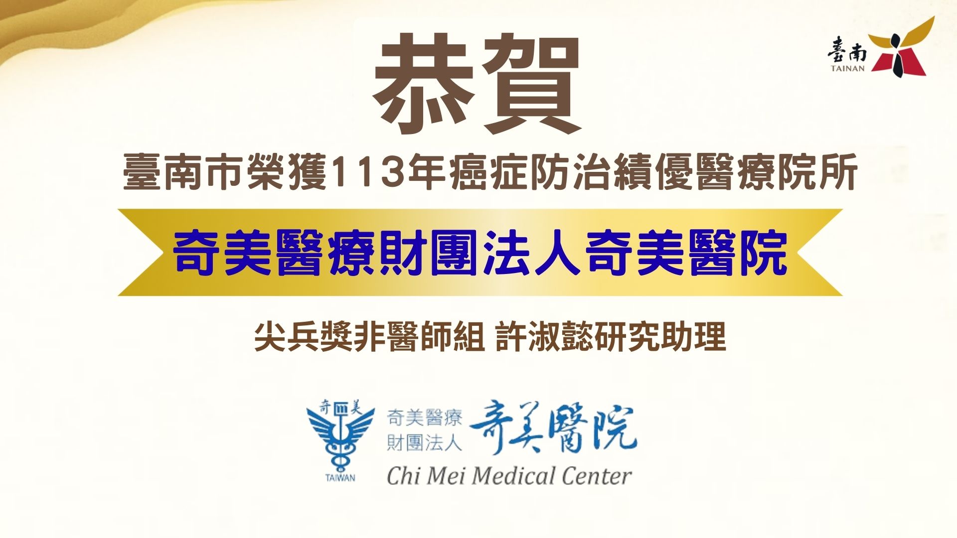 此外,個人組部分,奇美醫院的許淑懿研究助理因在癌症防治工作中的突出貢獻榮獲「防癌尖兵獎」,其不遺餘力的付出獲得了高度肯定。