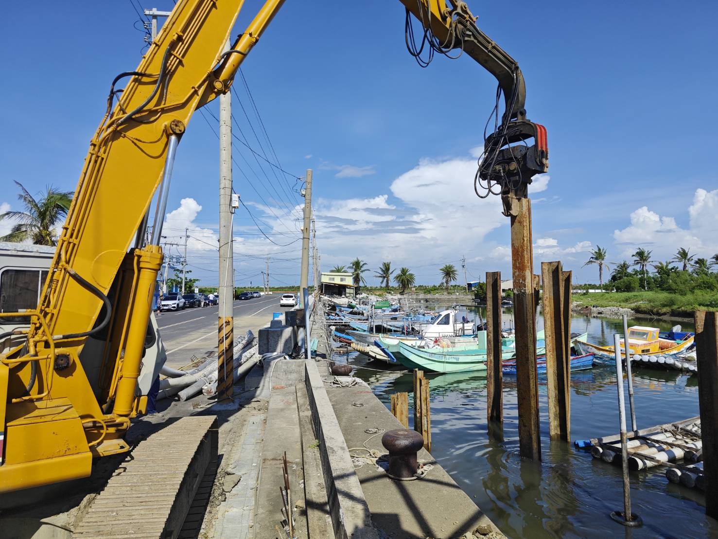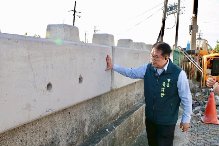 而面對楊柳颱風考驗,黃市長親自前往七股區西寮檢視防汛整備情形,並指示水利局立即完成3台移動式抽水機增佈,隨即前往將軍區青鯤鯓碼頭視察碼頭護欄加高情況及倒伏閘門運作情形。針對鯤溟里周里長反映老舊結構滲水問題,水利局則立即啟動搶修作業打設鋼板樁圍堰作業,將以最快速度進行應急補強。