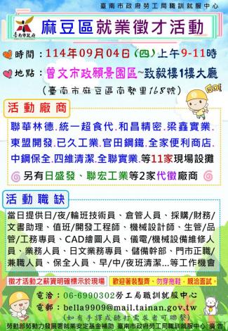 為打造黃偉哲市長「希望家園」的施政願景,勞工局積極辦理各項就業徵才活動,並因應產業求才需求,勞工局職訓就服中心將於9月4日(週四)上午9時至11時在曾文市政願景園區-致毅樓一樓大廳(麻豆區南勢里168號)辦理聯合徵才活動,邀請13家廠商提供361個職缺,歡迎求職民眾踴躍前往參加,洽詢電話:06-6990370/6990302。
