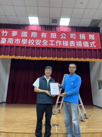 為落實社會服務,支持教育發展與安全意識提升,竹夢國際有限公司創辦人施昌邑先生透過市議員王宣貿以實際行動回饋地方,捐贈61座安全工作梯予南市新營區新營國小等61校,以增進校園環境的安全,此次善舉不僅展現企業對社會的關懷,也體現對校園安全環境的重視。今(22)日在南新國中舉辦捐贈表揚儀式,由臺南市教育局長鄭新輝代表市長黃偉哲頒發致謝獎狀,受贈學校亦到場共襄盛舉,一起見證富有意義的時刻。