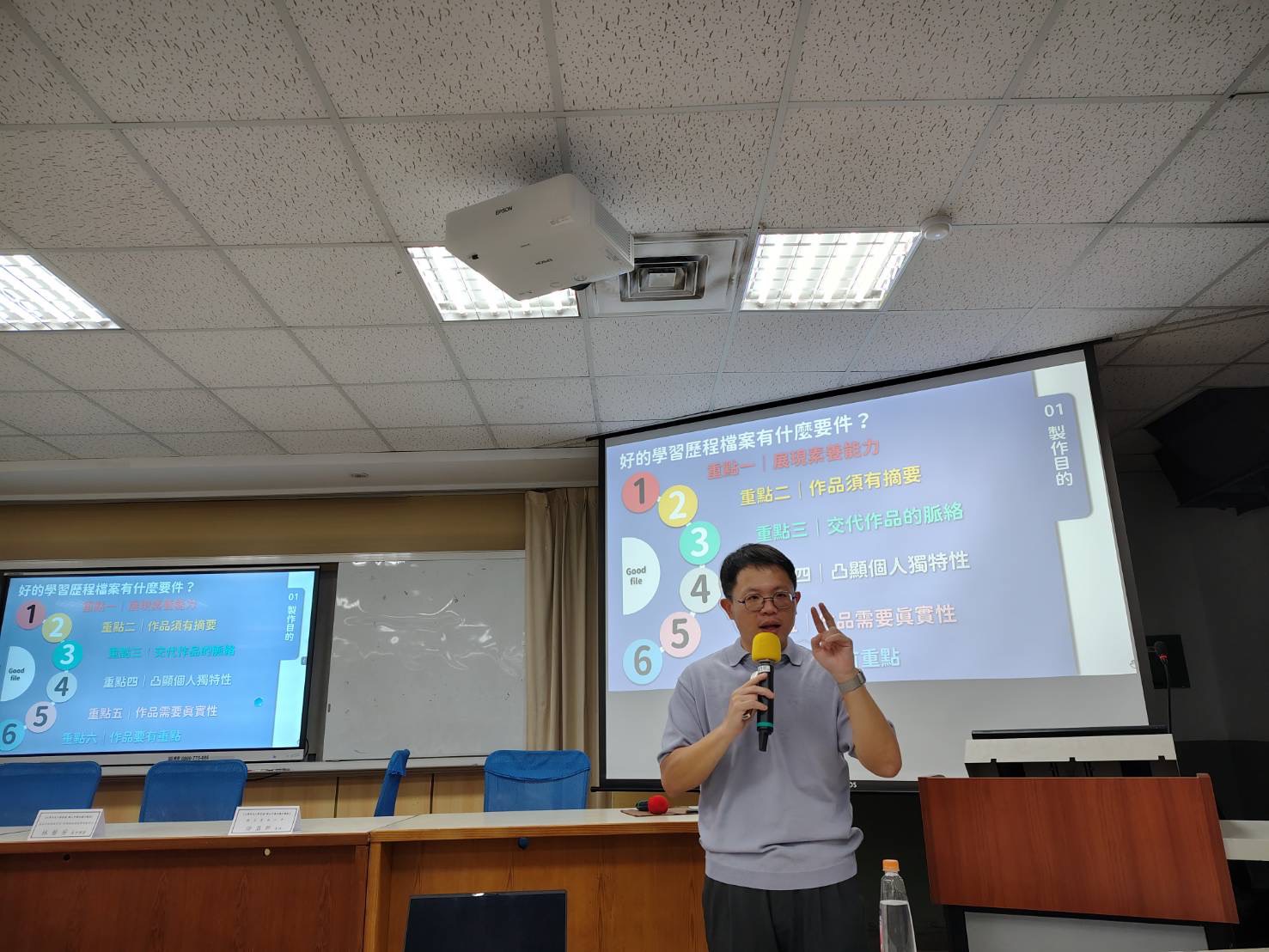 本次座談會首先由國立臺南二中教務主任涂益郎以「學習歷程檔案這樣做」為題,從大學入學管道比例與申請流程切入,說明學習歷程檔案在個人申請與技專院校甄選的重要性。他強調,學習歷程是一種「學習成果的儲蓄」,應重視課程學習成果、多元表現與心得反思的真實呈現,而非僅靠數量取勝。透過具體案例,他提醒家長如何支持孩子累積過程資料,並在適當時機轉化為有價值的升學資源。