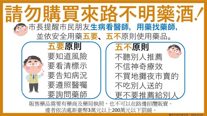 衞生局提醒市民朋友生病看醫生,用藥找藥師,並依安全用藥「五要」、「五不」原則使用藥品,「五要」原則:要知道風險、要看清標示、要告知病況、要遵照醫囑、要詢問藥師。「五不」原則:不聽別人推薦、不信神奇療效、不買地攤夜市賣的、不吃別人送的、更不要推薦給別人。
