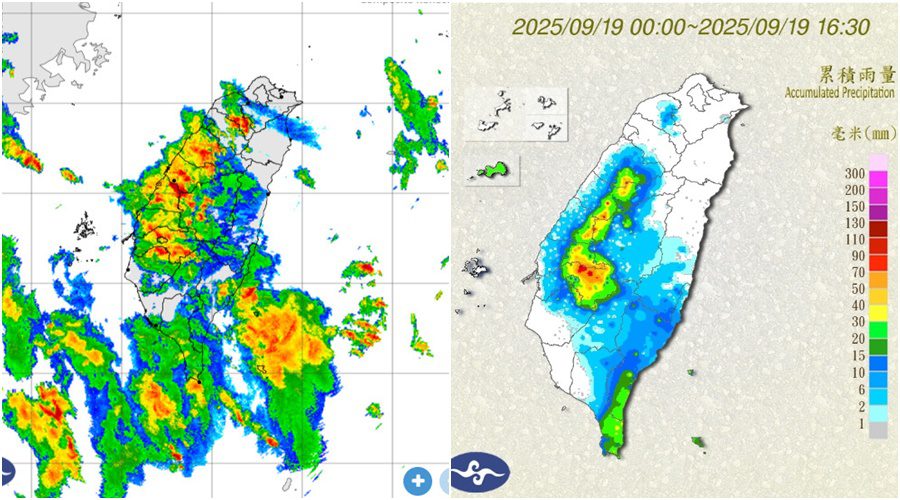 對流雲系持續發威,大雨豪雨範圍擴大!氣象署9月19日16時30分許發出豪雨特報,臺中市、南投縣、嘉義縣地區及苗栗縣山區有局部大雨或豪雨,桃園、苗栗、彰化至臺南、花蓮、臺東地區、蘭嶼、綠島、恆春半島,以及新北、新竹、高屏山區有局部大雨發生的機率,請注意雷擊、強陣風及溪水暴漲,低窪地區防積水。