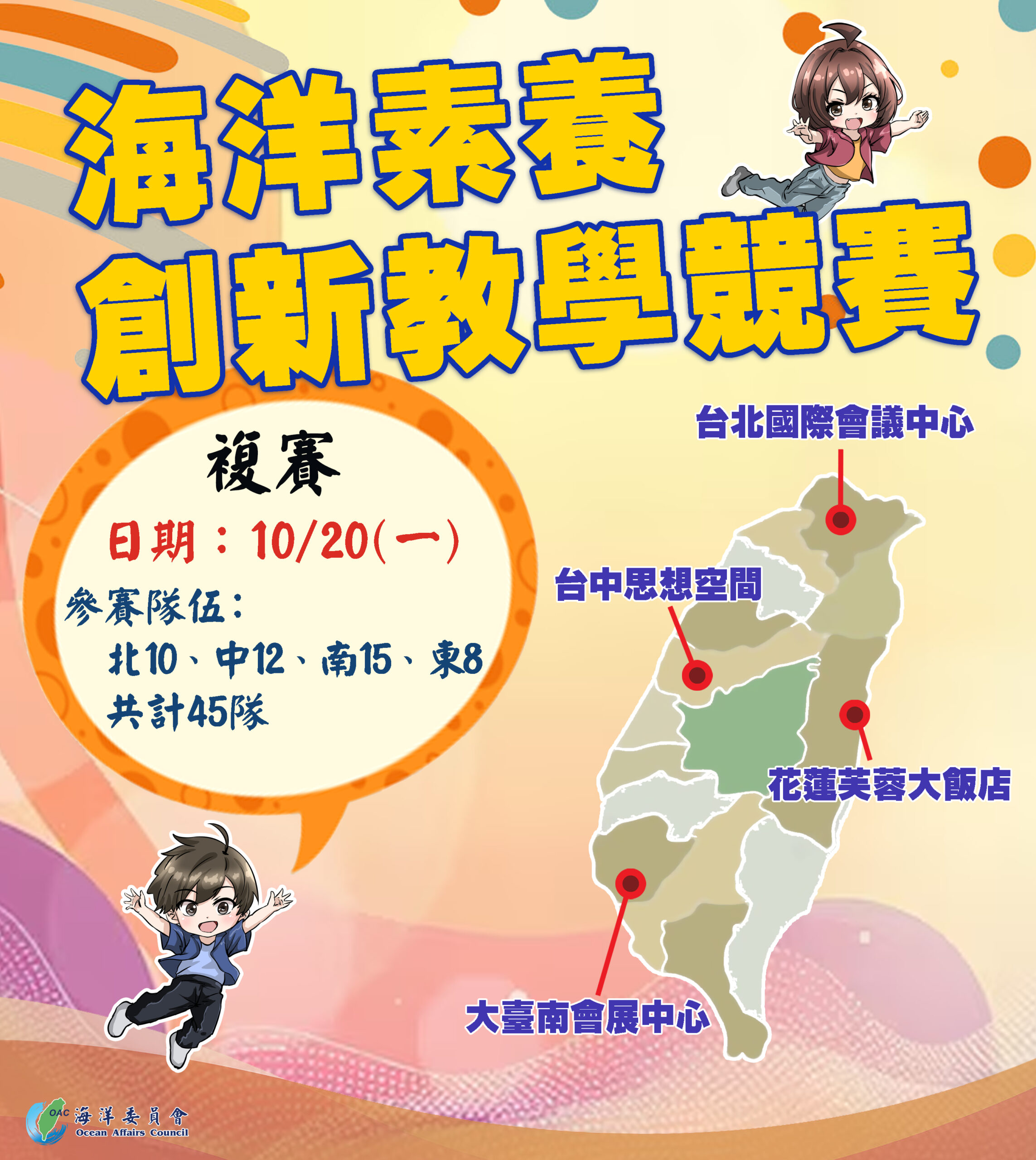 【記者蘇舒 / 宜蘭報導】 為推動我國海洋素養教育扎根校園,並提升師生對海洋素養的理解與應用能力,海洋委員會與國立臺灣海洋大學將於今(114)年10月20日(星期一)舉辦「114年度海洋素養創新教學競賽」,競賽以「海洋科學序列」(Ocean Sciences Sequence, OSS)教材為核心,採現場展攤操作演示評比,透過創意教學設計與在地資源結合,期望培養學生對海洋科學的興趣,以及面對海洋挑戰的能力,打造跨域且具創新的海洋素養教育平臺。今年共有55隊報名參賽,最終擇優錄取45隊晉級,並依北、中、南、東四區,於今年10月20日(星期一)舉行分區複賽