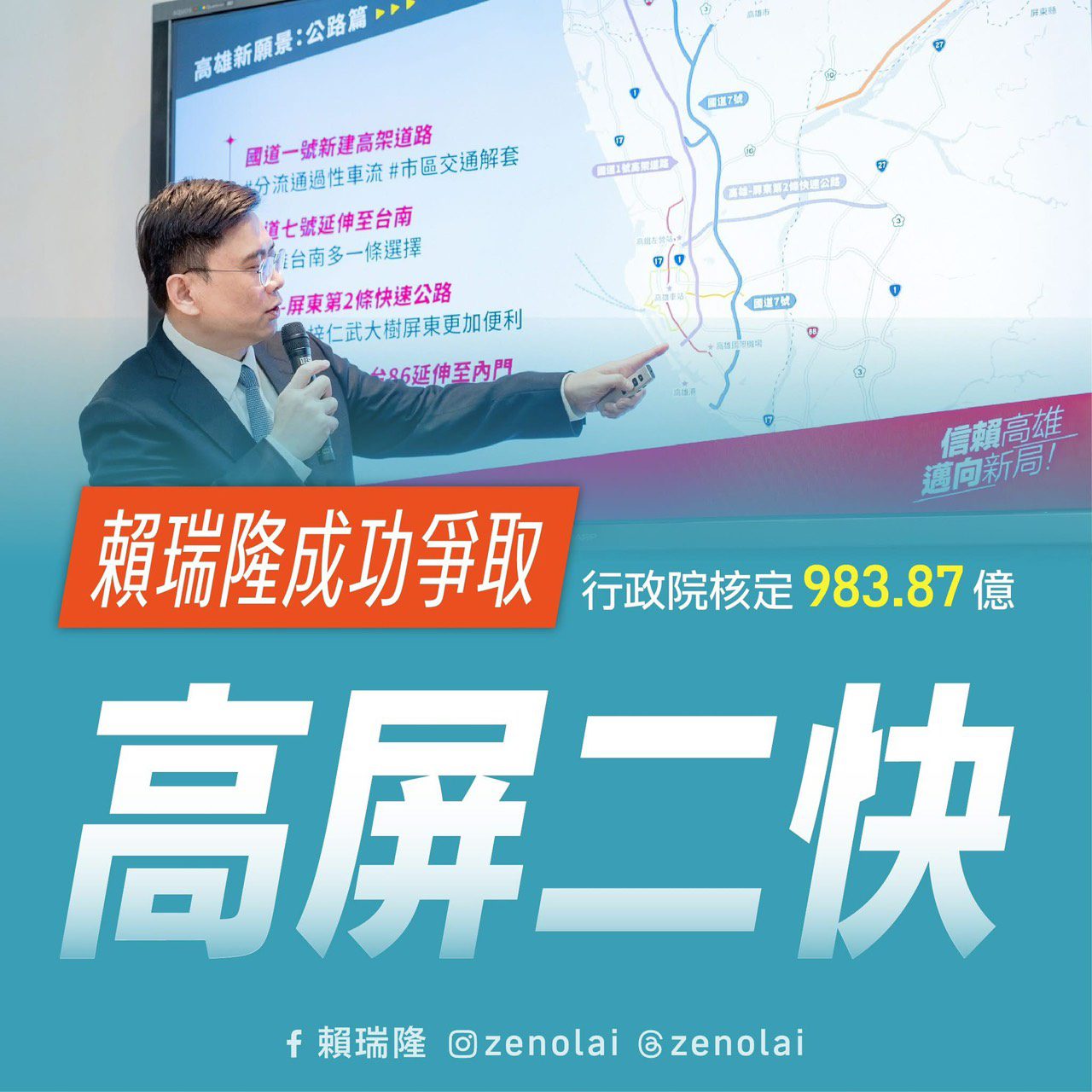 【記者蘇舒 / 高雄報導】 好消息!高雄市長參選人賴瑞隆立委表示 : 行政院核定983億「高雄-屏東第二條快速公路(高屏二快)」,串起南台灣關鍵產業、民生路廊!