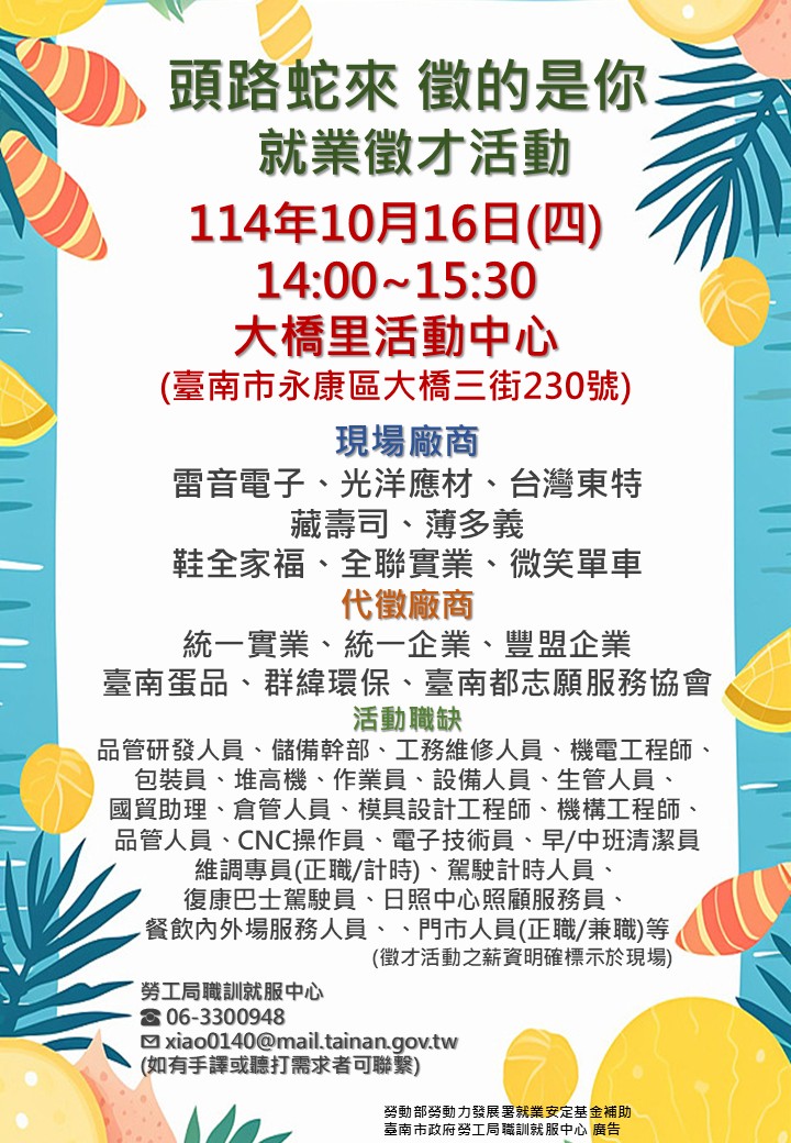 為打造黃偉哲市長「希望家園」的施政願景,勞工局積極辦理各項就業徵才活動,並因應產業求才需求,勞工局職訓就服中心將於10月16日(四)14時至15時30分在大橋里活動中心(永康區大橋三街230號)辦理『頭路蛇來 徵的是你』就業徵才活動,邀請14家廠商提供180個職缺,歡迎求職民眾踴躍前往參加,洽詢電話:06-3300948。