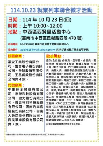 114/10/23(四)勞工局職訓就服中心辦理「114.10.23就業列車聯合徵才活動」,歡迎求職民眾踴躍參加