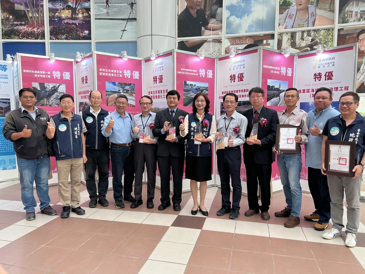 臺南市政府地政局辦理「臺南市喜樹灣裡市地重劃、代辦區外灣1滯洪池及抽水站工程」,榮獲市府第7屆公共工程優質獎土木工程類第1級特優,10月22日接受黃偉哲市長親自頒獎,南區喜樹灣裡市地重劃區活化國宅基金土地,工程規劃滯洪池及抽水站,改善地勢低窪排水問題,自111年5月開工至今約3年半如期如質順利完工,並榮獲市府公共工程優質獎最高獎項,實屬不易,再此對地政局及施工團隊表示肯定。