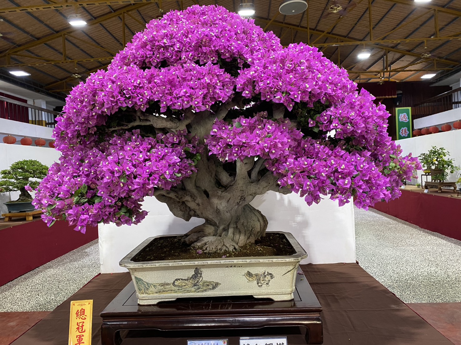 農業局長李芳林指出,本次展覽網羅全國頂尖藝術盆栽,共展出25種樹種、92件精選作品與110棵盆栽,種類多樣、風格獨具。評審團經嚴謹評選,選出總冠軍、菓王、花后,以及各組金、銀、銅牌得主。其中總冠軍由薛石柱的九重葛榮獲,作品透過精緻設計,展現盆器與植栽的和諧搭配,不僅結構成熟穩定,姿態自然優美,更散發出氣韻平衡的藝術氛圍,深獲評審一致肯定。