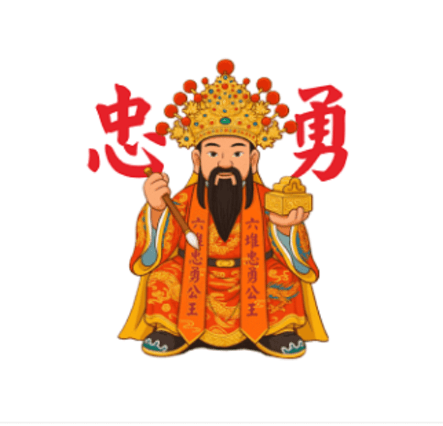 ✨特色亮點:此次推出的貼圖共計 24 款,每一款皆保留忠勇公王經典造型──金冠華服、紅袍金龍、手持玉璽與文昌筆──以Q版造型呈現多樣表情與動作,包括:「感恩啦!!」、「平安報」、「保庇!!保庇!!」等傳統祝福語,更融入「好棒棒!!」、「OK啦!!」、「厲害面對」等現代口語互動,搭配節慶、祈福、考試、工作、生活場景皆可靈活應用的表情設計。