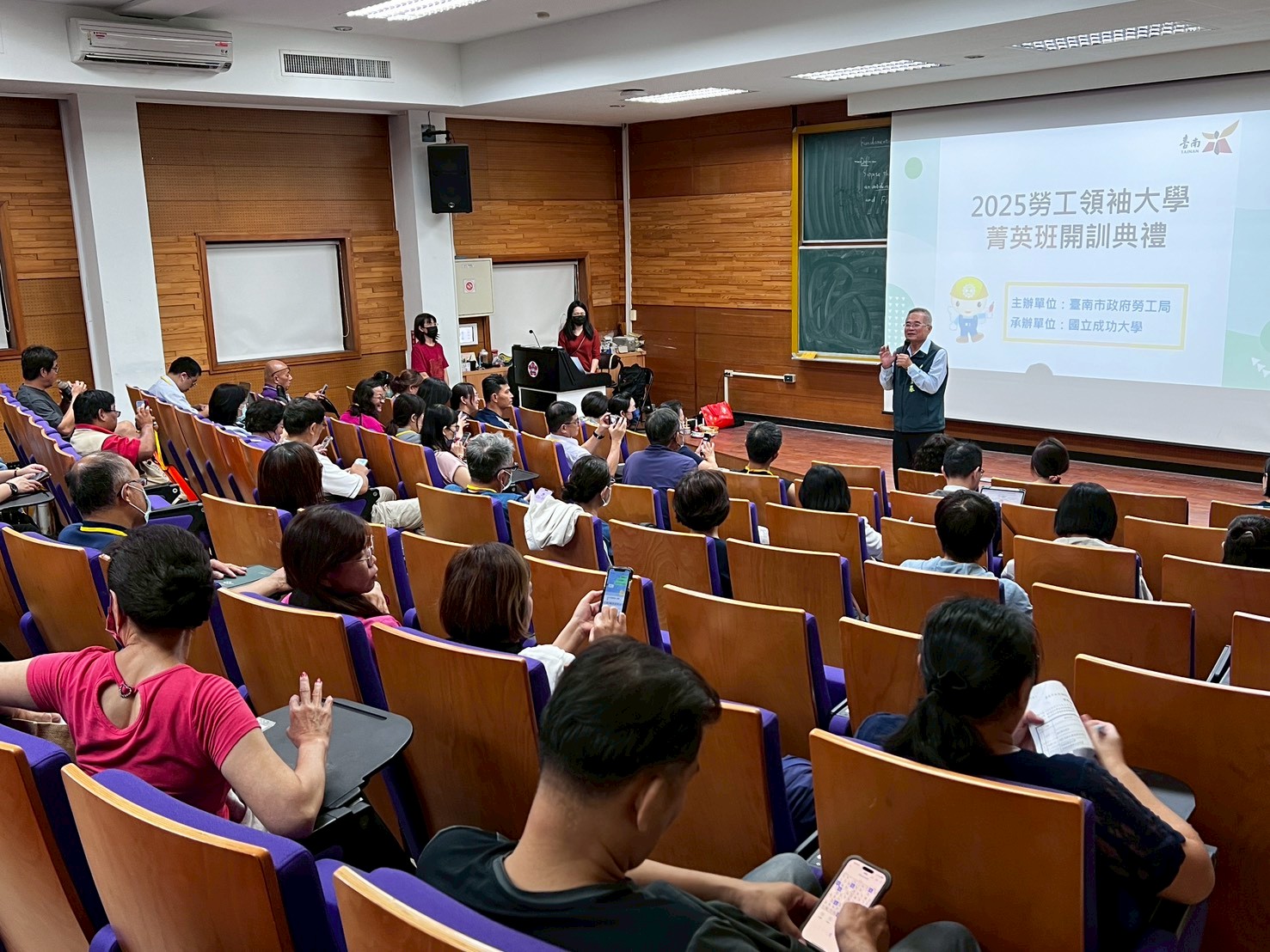 勞工局王鑫基局長致詞時感謝成功大學的協助與支持,提供優質的師資與完善的學習環境,與勞工局共同規劃多元實用的課程,讓勞工朋友能在成大的學習殿堂中持續成長。王鑫基進一步說「勞工領袖大學」透過初階、進階、高階到菁英班的階梯式學習系統,讓在職勞工能系統化提升職能,打造終身學習的環境,自開辦以來,已培訓3,815位學員,成為臺南市推動勞工教育的重要品牌。勞工局訓練品質有目共睹,今(114)年參加TTQS訓練品質評核,再度榮獲金牌肯定,創下連續15年蟬聯金牌的佳績,這不只是榮譽,更是團隊與各位勞工夥伴共同努力的成果。王鑫基強調「勞工領袖大學」不僅是知識傳遞的場域,更是凝聚勞工夥伴、交流經驗與相互激勵的重要平台。