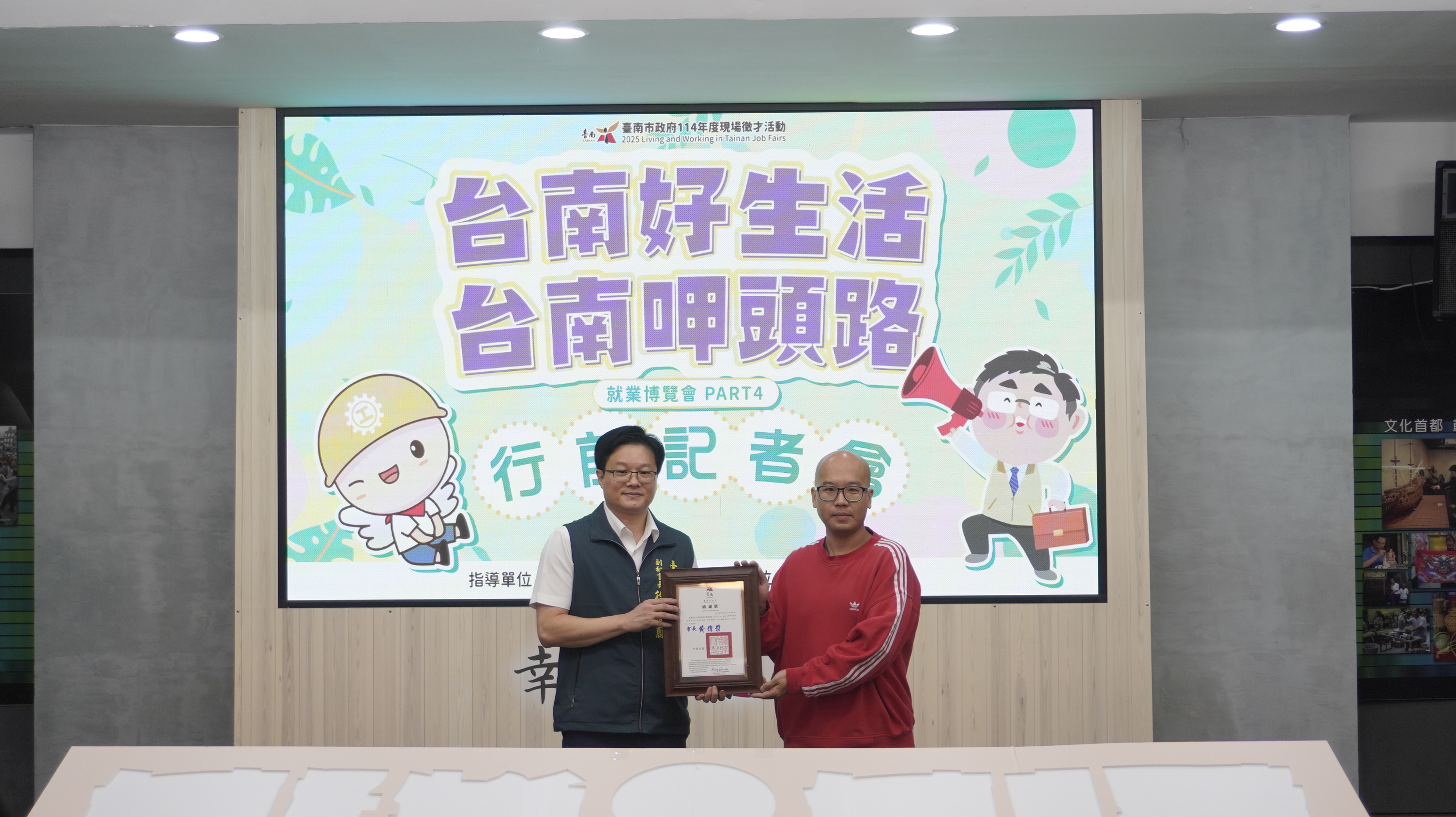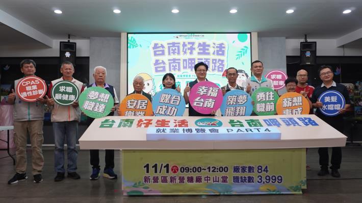 今(28)日在新營區民治市政中心行政大樓1樓大廳舉辦2025「台南好生活 台南呷頭路」第4場大型就業博覽會行前記者會,由副秘書長徐健麟、勞工局副局長顏靚殷、鹽水區公所區長陳文琪、大台南總工會理事長鄭山林、臺南直轄市總工會理事長黃江福、台南市產業總工會常務理事董嘉明、理事黃育彬、台南市職業總工會祕書長吳允昌、社團法人台南市勞工志願服務協會理事長梁志男、台南市中小企業榮譽指導員協進會會長吳妤姍、臺南市中小企業服務中心專員陳麗如、崑山科技大學研究發展處副研發長王平、社團法人中華職訓教育發展協會常務監事林尉民等多位貴賓親臨記者會,共同鼓勵求職者11月1日來「台南呷頭路」,找到好工作。