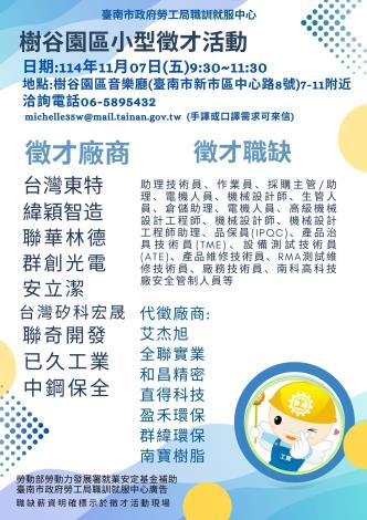114/11/07(五)勞工局職訓就服中心辦理樹谷園區音樂廳小型徵才活動,歡迎求職民眾踴躍參加。
