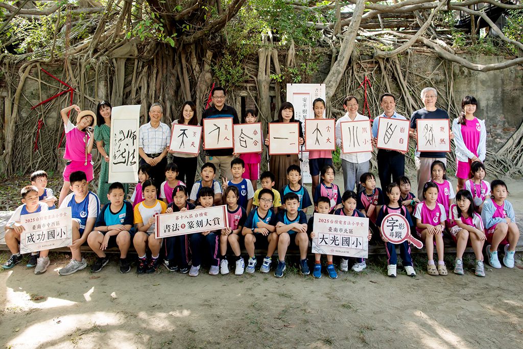 【記者吳玉惠/臺南報導】 台積電文教基金會主辦第18屆「台積電書法暨篆刻大賞」,以「師法自然」為主題,今(29)日下午與臺南市政府文化局合作,在有「活的建築」之稱的安平樹屋舉辦首屆「台積電書法小學堂」戶外教學活動。活動邀請臺南市大光與成功國小32位學童參與,台積電文教基金會董事王建光、執行長許峻郎、臺南市文化局專門委員方敏華與書法家黃宗義等貴賓,共同題寫「天人合一,大小自然」,為本屆大賞揭幕。臺南市文化局黃雅玲局長也特地抽空,現身為台積電書篆大賞讚聲。