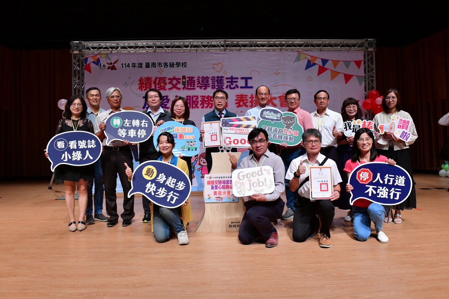 臺南市114年績優導護志工暨愛心服務站表揚活動於今(1)日下午在臺南市新市樹谷園區音樂廳舉行,由臺南市長黃偉哲頒獎表揚172位導護志工及62位愛心服務站成員;並頒發獎項予15團績優志工團隊,感謝志工長期守護學生安全的無私付出與堅持。