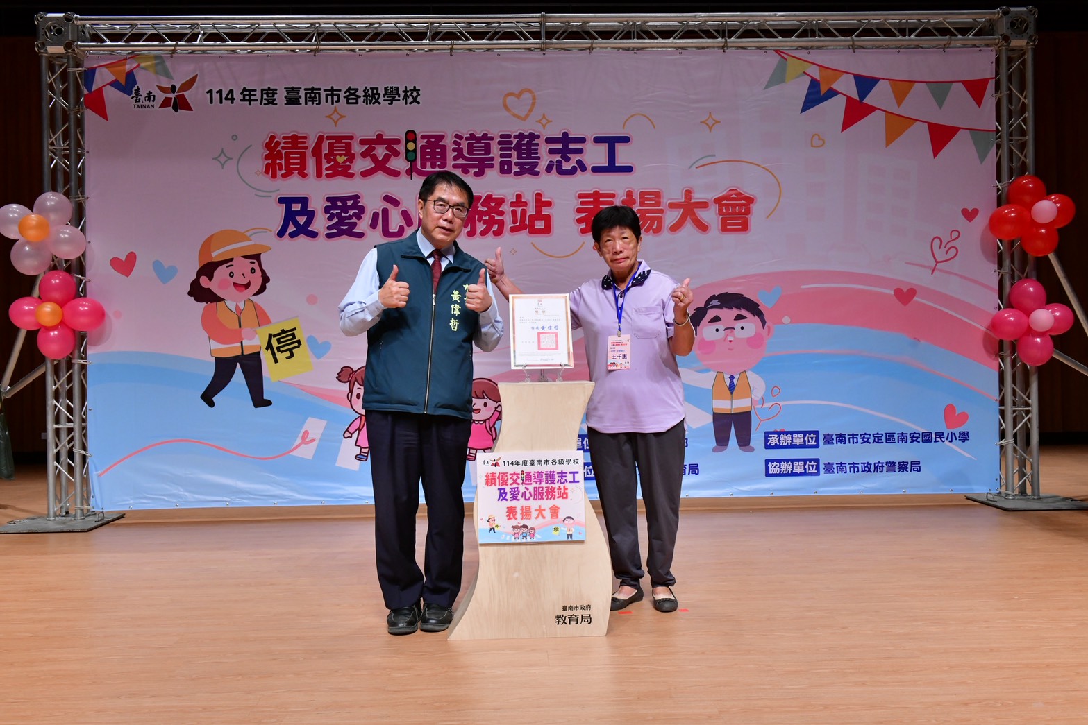 教育局長鄭新輝表示,表揚對象皆由各校遴選推薦,須服務滿年限且表現優異,導護志工須服務滿2年以上,愛心服務站則須至少1年。今年表揚的志工中,服務年資超過20年者有33位,其中30年以上者有8位,分別是歸仁區歸南國小邱玉華及趙玉印、永康區永康國小王千惠、永康區復興國小蔡來美、善化區善糖國小施乃碧、柳營區新山國小許秀花、東區崇學國小侯華受、南區省躬國小戴鳳英,長期堅守崗位守護學生交通安全,令人敬佩。
