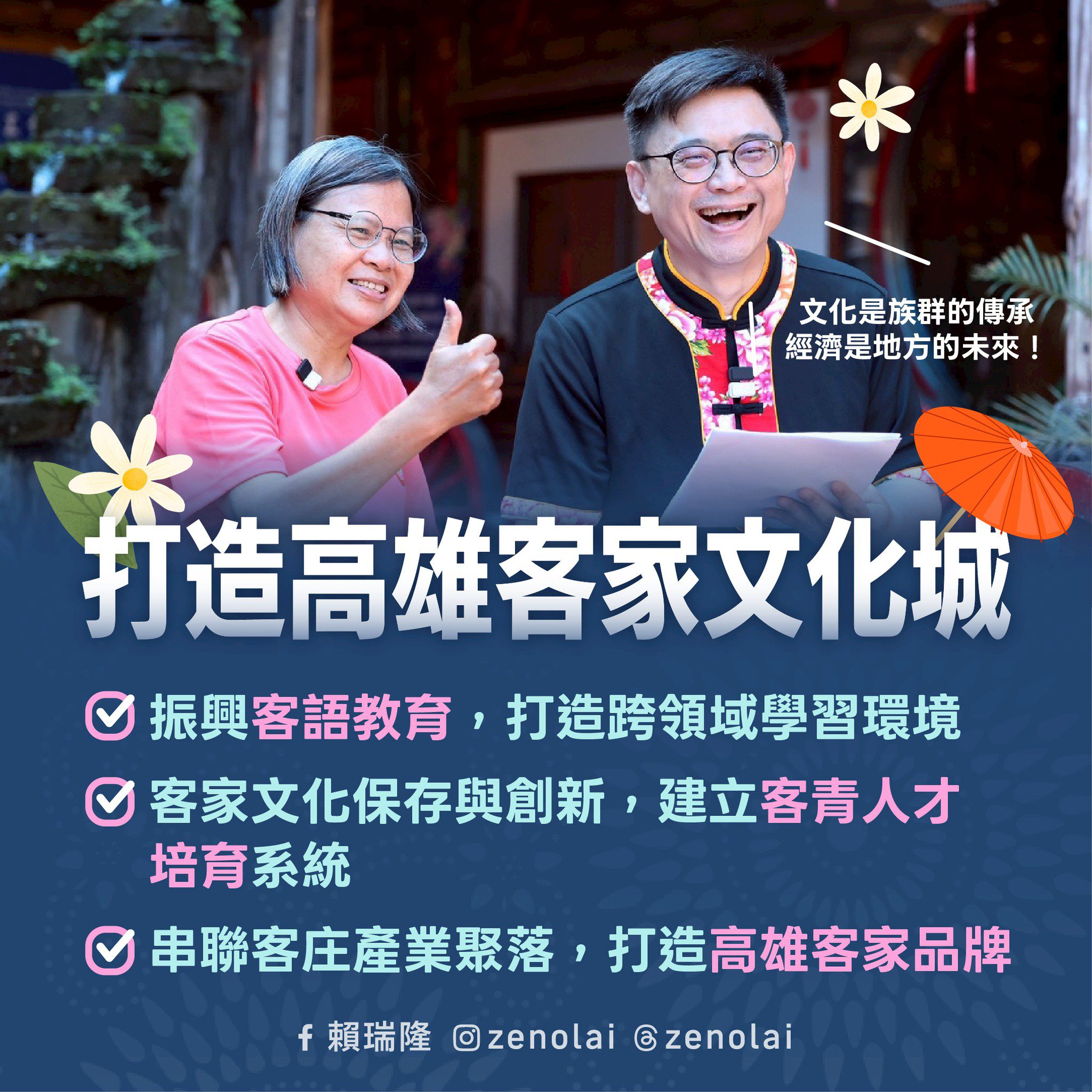 賴瑞隆強調,文化是族群的傳承,經濟是地方的未來。他將發揚客庄之美、使客家文化薪火相傳、使客家產業再現風華,讓高雄在地的客家青年都能以自己的文化為傲。