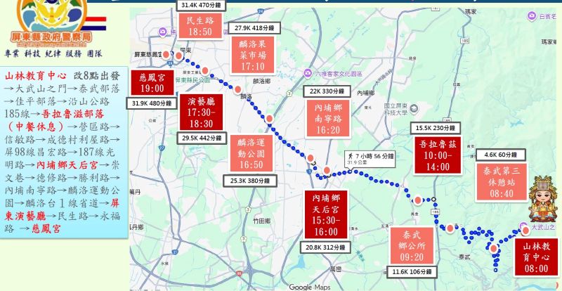 ▼終點山林教育中心(舊泰武國小)夜宿,5日至7日完成揹媽祖上大武山之壯舉;8日循原路線回程徒步返回屏東市慈鳳宮。(圖/屏東縣政府警察局)