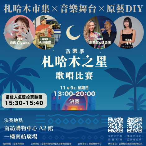 臺南市政府原住民族事務委員會將於114年11月9日(星期日)下午1時至晚間8時,在南紡購物中心A2館一樓南紡廣場舉辦「札哈木音樂季-札哈木之星歌唱比賽決賽」。8位優秀決賽選手將在這天展開精彩的歌唱對決,角逐「札哈木之星」冠軍寶座。
