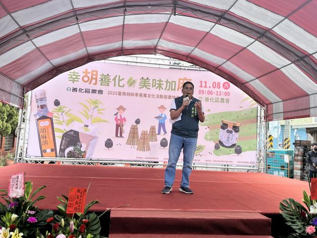 農業局長李芳林指出,臺南市為全臺胡麻最大產區,種植面積約1,215公頃,其中善化胡麻的種植面積約175頃,為本市重要胡麻生產重鎮之一。善化區農會長年與農民契作並辦理收購,積極推動胡麻產業發展,並以自有品牌「醇善」為胡麻系列產品名稱,持續研發多樣胡麻加工品,如胡麻油、芝麻醬、芝麻糕點與冰品等,展現在地農產創新能量。鼓勵民眾把握今日活動優惠多加購買相關系列商品,一同支持在地香醇又營養的芝麻好滋味。