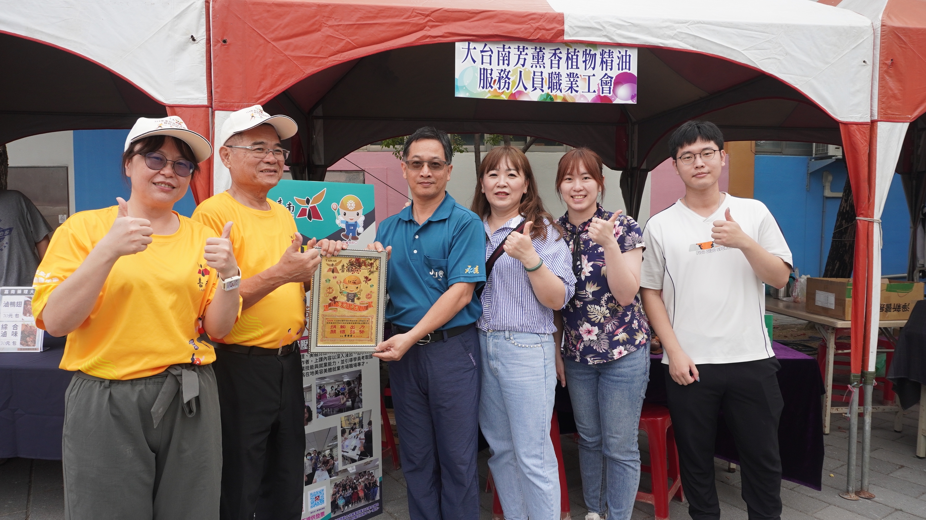 為建構黃偉哲市長「希望家園」的施政願景,勞工局每年開辦逾70班次訓練課程,協助學員養成專業職能並輔導就業,今(9)日結合勞資運動會辦理成果展示,呈現學員訓練成品外,並擴散學習成效做公益回饋,將義賣金額共99,580元捐贈給社團法人台南市勞工志願服務協會,作為弱勢及職災勞工房屋修繕,發揮人才培育價值。