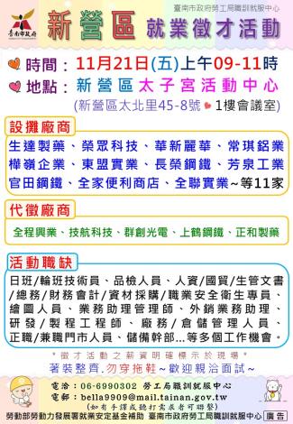 為打造黃偉哲市長「希望家園」的施政願景,勞工局積極辦理各項就業徵才活動,並因應產業求才需求,勞工局職訓就服中心將於11月21日(週五)上午9時至11時在新營區太北里45-8號1樓會議室(新營區太子宮活動中心)辦理聯合徵才活動,邀請15家廠商提供369個職缺,歡迎求職民眾踴躍前往參加,洽詢電話:06-6990370/6990302。