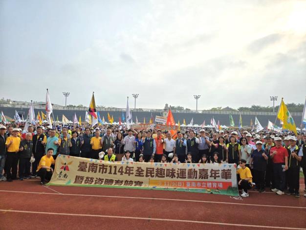 114年全民趣味運動嘉年華會暨勞資體育競賽於今(9)日於臺南市立體育場熱鬧登場,各區踴躍參與,各顯身手參加趣味賽事,包含公教團體及長青組共53隊1,123人及勞資團體90隊2,366人參加。黃偉哲市長親臨現場歡迎公務機關同仁、學校老師與勞工朋友們,在忙碌的工作之餘作夥來運動。
