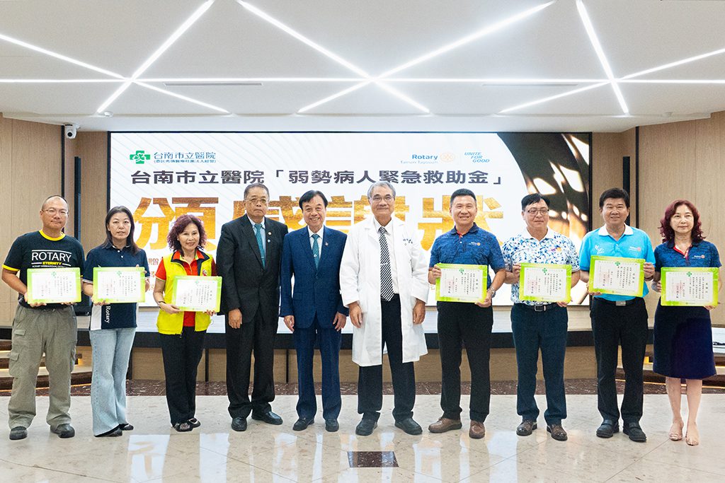 台南市立醫院院長蔡良敏感謝各扶輪社及學會的慷慨捐助,並承諾這筆款項將專款專用,作為弱勢病患的醫療補助。他指出,這筆基金的運作將如同生命線,讓醫療團隊能在最需要的時刻伸出援手。蔡良敏院長也特別提到,台南大員扶輪社社長楊政憲的父親,正是他在大內地區巡迴醫療時照護的病人,如今楊社長與各社友的愛心捐款回饋社會,更讓他深感溫暖與欣慰。